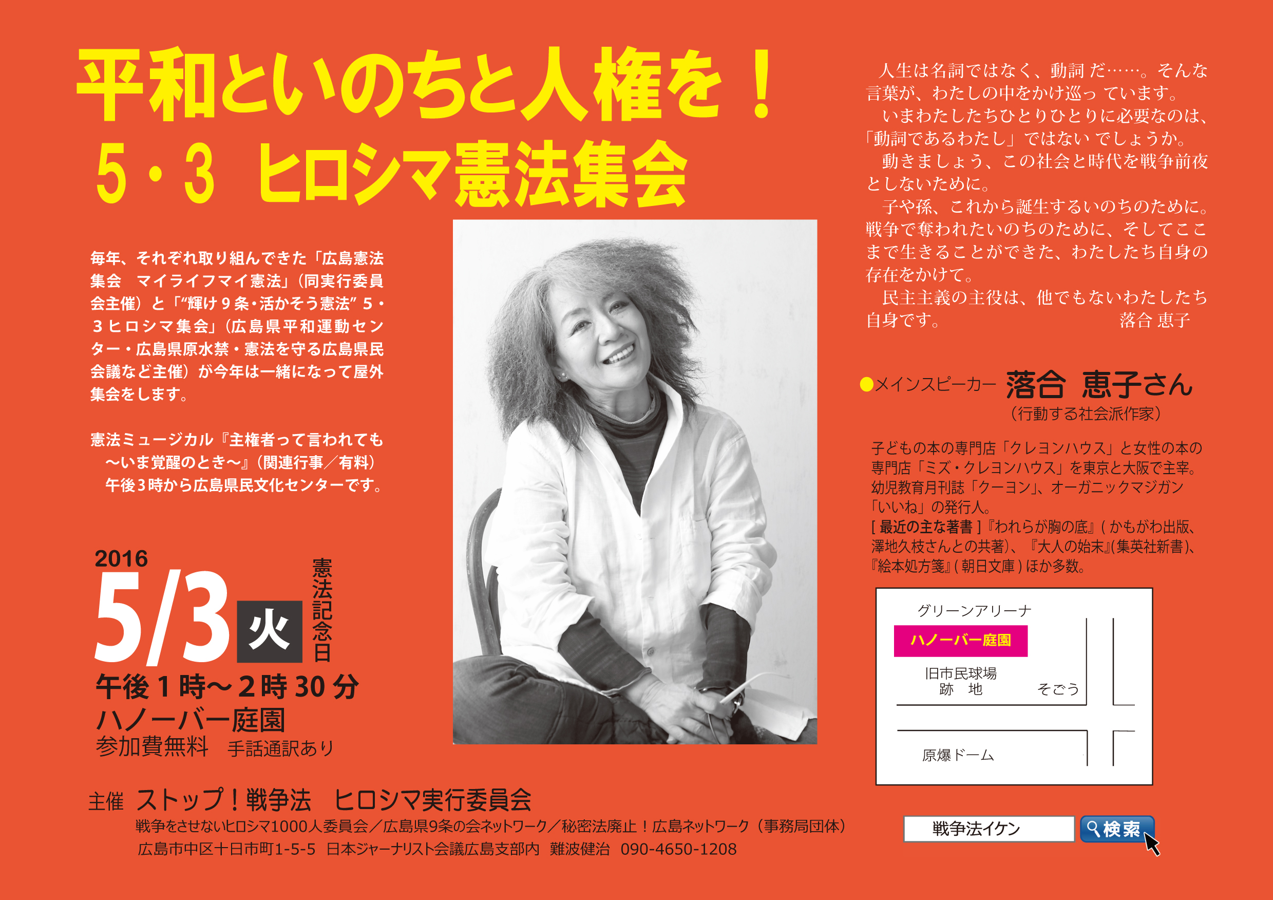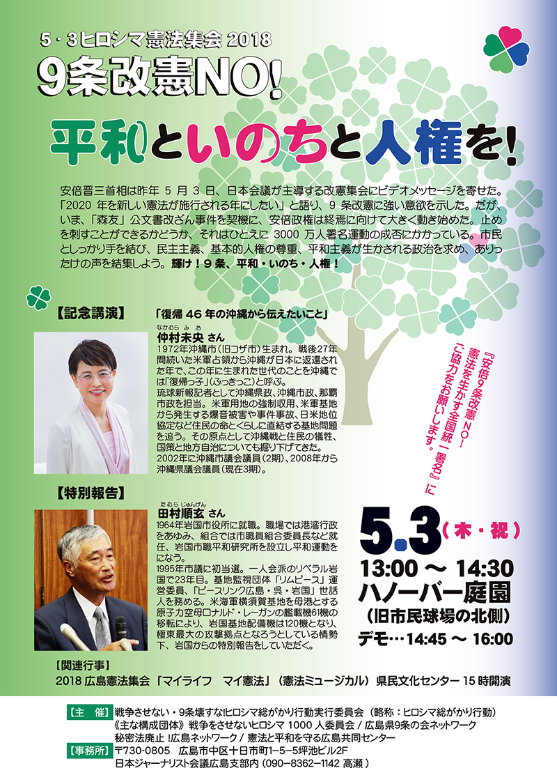 5月3憲法記念日に今年2018年も、戦争させない・9条壊すな!ヒロシマ総がかり行動で、憲法集会を開催し、18年の改憲発議をさせないようデモをして、平和にフラワーフェスティバルを楽しむ市民の皆さんに声を届けましょう。