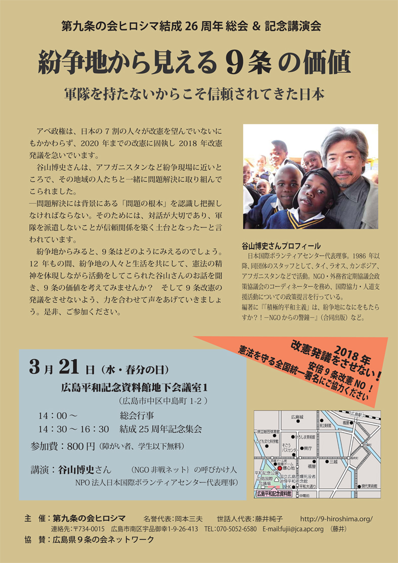 軍隊を持たないからこそ信頼されてきた日本、紛争地で武器を持たず、現地の人々から信頼を得て活動をされてきた谷山博史さん(ボランティアセンター 代表理事)のお話から9条の価値を再確認し、安倍9条改憲に立ち向かう力にしていきたいと思います。お誘いあわせの上、どうぞご参加ください。