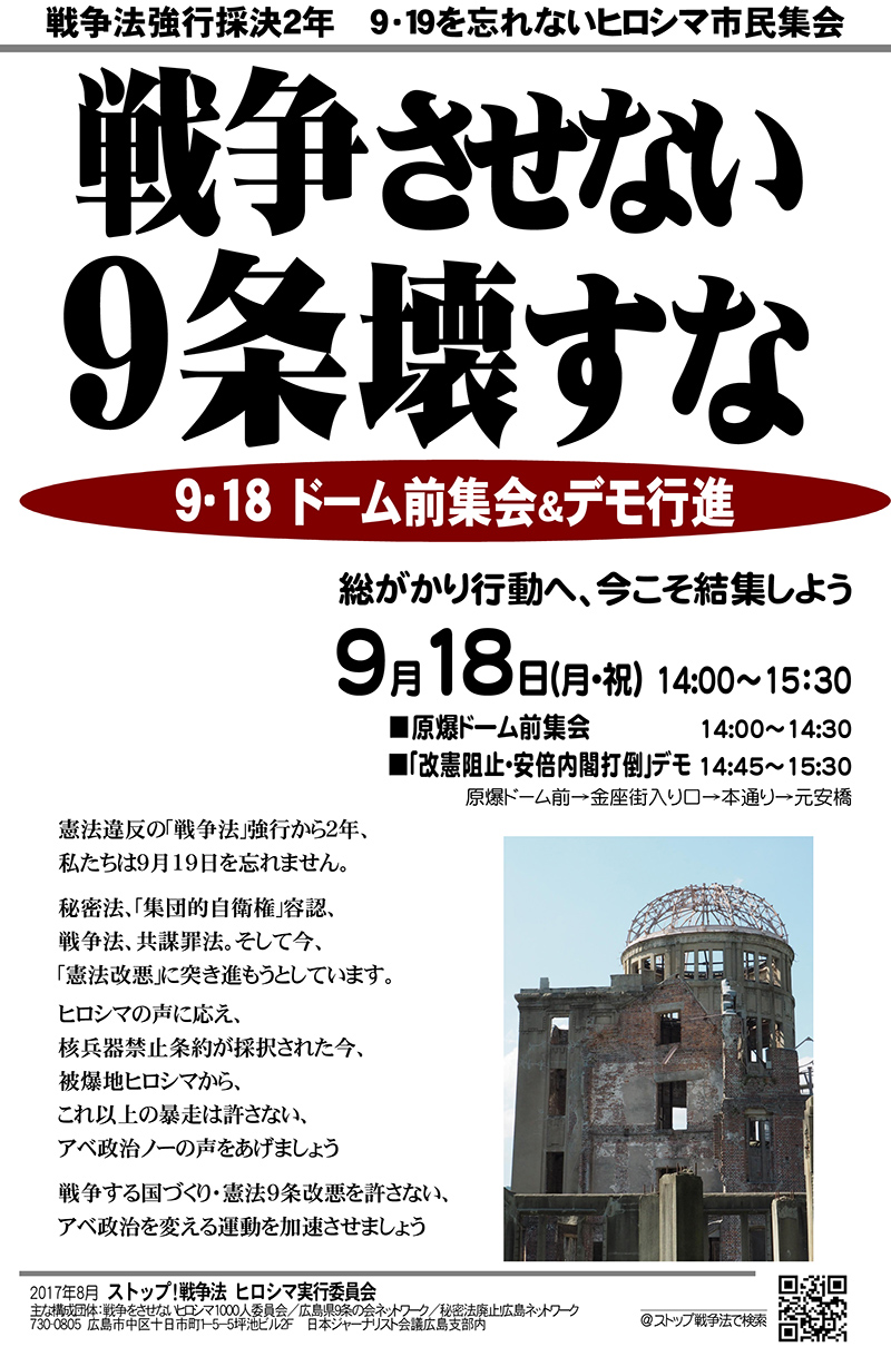 憲法違反の戦争法は廃止したいと思う人には署名もしてもらいましょう。核のない、平和な社会をめざすヒロシマ市民の意志表示。どうぞ応援に駆け付けてください。