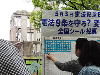 5月3日、憲法記念日に、第九条の会ヒロシマは午前中、小雨の中、「憲法9条を守る? 変える? 市民シール投票」を行いました。(取材:NHK ホームテレビ、中国、毎日)