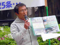 ・上関原発止めよう!広島ネットワークの事務局長の溝田一成さんは、まず64年前、主権者は私たち、人権を尊重し平和主義の憲法を国民が選び取ったものであることを確認し、生かすことが大切だと前置きし、福島原発事故の大変な状況を話されました。しかし日本の原子力政策は変わらない、原発を進める教育が忍び寄っている、大きな転換をさせるために声を上げようと訴えられました。