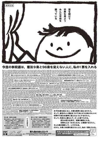 参議院を改憲賛成派多数にしてはなりません。そのため、選挙前に「憲法を守り、活かす議員を選ぼう」という意見広告を新聞に掲載します。グループや個人でご参加ください。