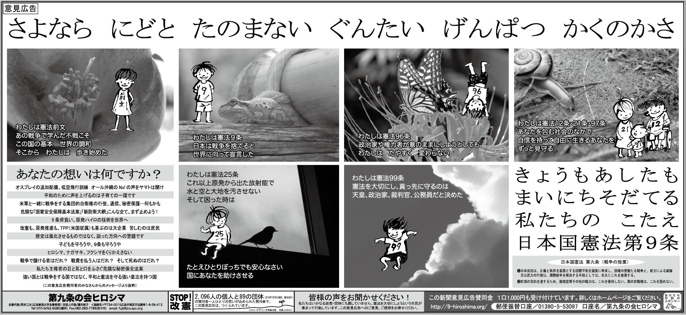 8月6日も核のない平和な社会を目指してストップ改憲意見広告を掲載します。ご賛同、ご支援ください。